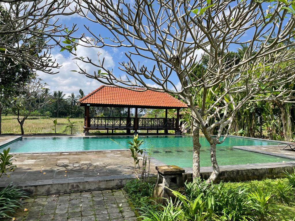 The spiritual centre offers a vegetarian restaurant, a more private dining area in the garden, a large swimming pool, a yoga hall next to paddy fields, a temple shala with authentic Balinese vibes, a paddy deck, as well as a meditation pyramid. All rooms have AC and a private bathroom.